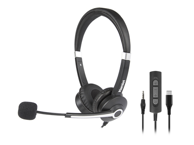 Hamlet Renova Headset modello CJS è una cuffia stereo per uso professionale con microfono regolabile che consente la comunicazione a mani libere progettata per un uso prolungato. La doppia modalità di connessione sia con jack audio da 3,5 mm che connettore USB-C permette l'utilizzo con Computer, Notebook, Smartphone e Tablet. È la soluzione ideale per videoconferenze e chiamate vocali via internet tramite applicazioni come Skype™, Zoom, NetMeeting. Renova Headset CJS ha un design leggero e confortevole grazie all'archetto regolabile e ai morbidi auricolari on ear in similpelle imbottiti intercambiabili. Il microfono omnidirezionale, dotato di riduzione dei rumori di fondo, offre una buona qualità della voce e può essere ruotato di 270 gradi per l'utilizzo a sinistra o a destra. Sul cavo è presente il telecomando con il controllo del volume e funzione Mute. L'installazione è completamente Plug-and-Play, è sufficiente collegare il cavo al computer senza la necessità di installare software aggiuntivo.