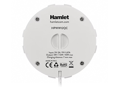 Hamlet Wireless Charger 10W da incasso a scomparsa con incluso alimentatore USB Quick Charge da 18W. Potenza massima wireless 10W. Distanza massima per utilizzo ottimale 7mm. Cavo USB di alimentazione lunghezza 150 cm.