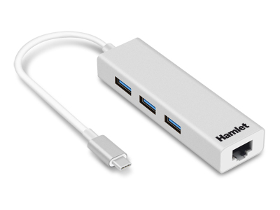 Hamlet USB 3.1 Type-C Hub + LAN è un adattatore 2 in 1 che aggiunge tre porte USB 3.0 Tipo A e una scheda di rete Gigabit al vostro notebook dotato di porta USB-C permettendo l'uso simultaneo di tre dispositivi USB e connettività di rete fino a 1000 Mbps. La connessione USB 3.1 Type-C offre eccellenti prestazioni con un trasferimento dati fino a 5 Gbps. Il leggero design in alluminio e le dimensioni compatte lo rendono facile da trasportare.