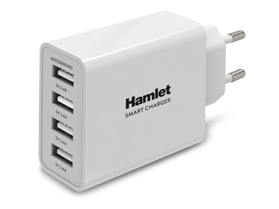 Hamlet USB Wall Charger è un potente alimentatore USB da parete 25W in grado di caricare 4 dispositivi USB contemporaneamente. La tecnologia Smart Charge di cui è dotato può riconoscere automaticamente il dispositivo collegato ed erogare la quantità di corrente necessaria a garantire la massima velocità di ricarica fino a 2400mA per porta.