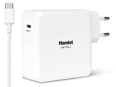 Hamlet 61W Type-C Charger è un alimentatore universale che permette di ricaricare velocemente Notebook e dispositivi mobili come Smartphone e Tablet PC dotati di porta USB-C. La tecnologia USB Power Delivery rileva automaticamente il dispositivo collegato e fornisce la potenza corretta per la ricarica più veloce possibile. Il cavo di ricarica USB Type-C da 1,8 metri è incluso nella confezione.
