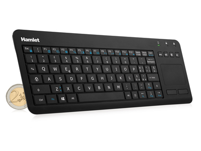 Hamlet Wireless Smart TV Keyboard è una tastiera compatta dotata di un pratico touchpad e due pulsanti per il controllo del mouse in grado di comunicare senza fili grazie alla tecnologia wireless RF a 2.4GHz. È la soluzione ideale per controllare comodamente dispositivi come Smart TV, Videoproiettori, Media Center, Computer, Tablet PC e Smartphone. La tastiera funziona con due comuni batterie tipo AAA che garantiscono un prolungato utilizzo del dispositivo e include un nano ricevitore USB per il collegamento senza fili.